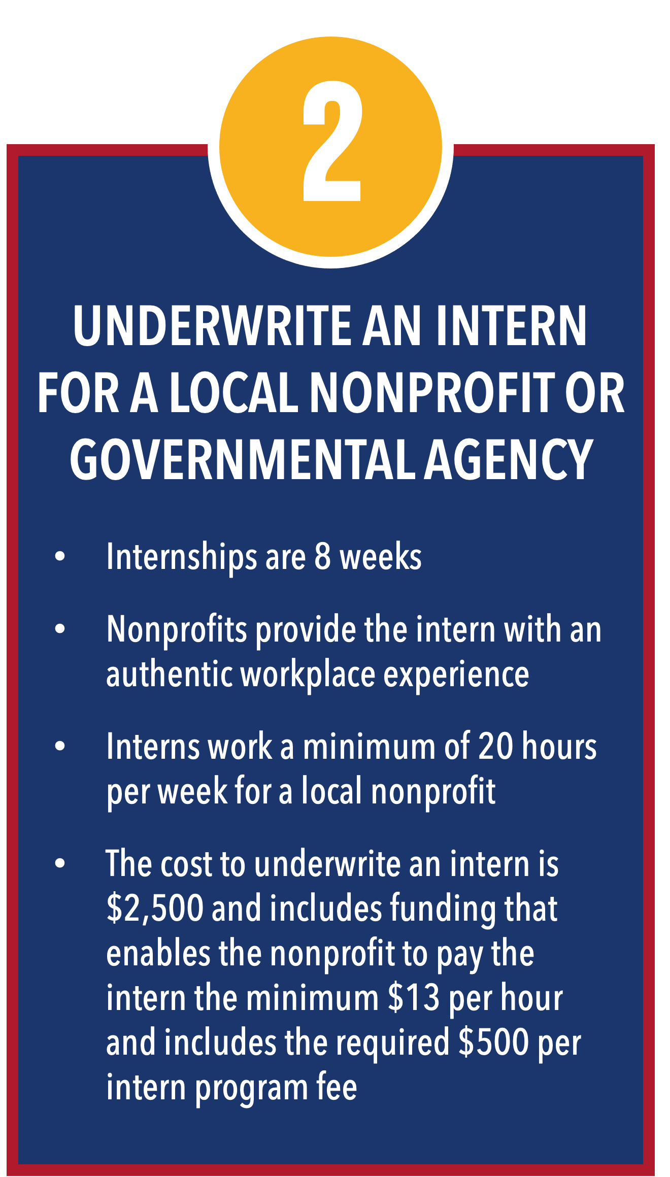 Through the generous support of corporate and philanthropic partners, we are able to place students in internships with local nonprofits at minimal cost to the nonprofit thus providing valuable experience to the students and much-needed staff support for the organization.